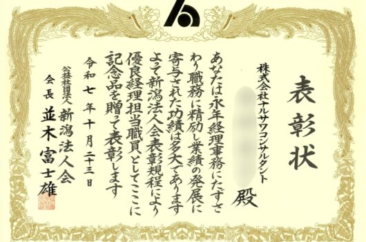 このたび弊社の経理担当者(本社並びに高田支店の計2名)が、公益社団法人新潟法人会より優良経理担当職員として表彰されました。