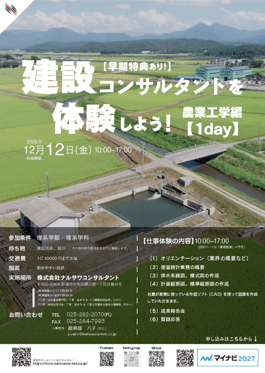2025.10.06 イベント 【開催案内】1day 建設コンサルタントを体験しよう!~農業工学編~ 就業体験を下記のとおり開催いたします! ▼申し込みはマイナビ2027からお願いいたします▼ マイナビ2027 たくさんのご参加をお待ちしております! お知らせ詳細
