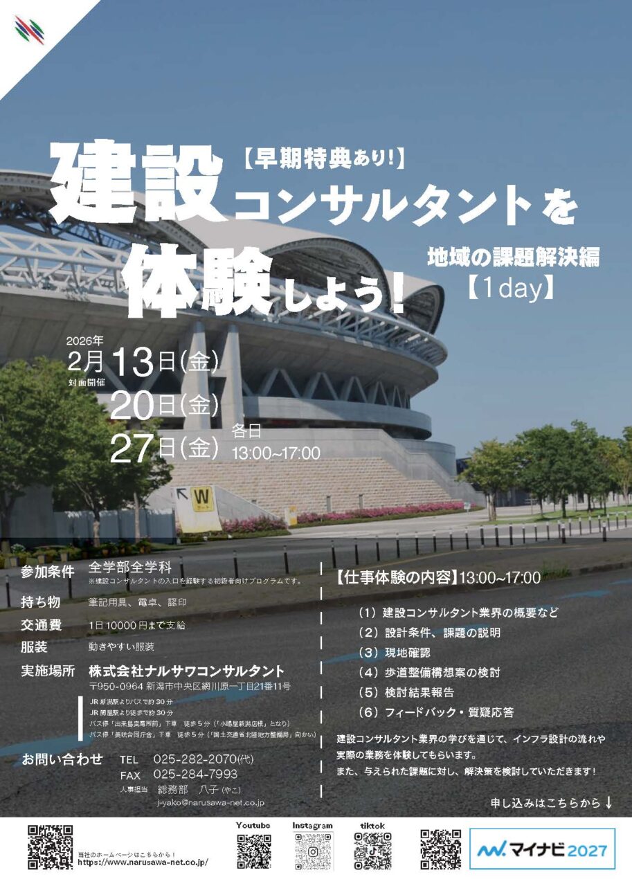 2025.10.06 イベント 【開催案内】1day 建設コンサルタントを体験しよう!~地域の課題解決編~ 就業体験を下記のとおり開催いたします! ▼申し込みはマイナビ2027からお願いいたします▼ マイナビ2027 たくさんのご参加をお待ちしております! お知らせ詳細